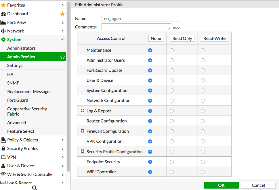 1. 在System>Admin Profiles 新增一個Admin設置,老外都喜歡叫no_logon,Access Control設成全部None。
